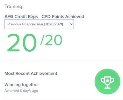 Log into the AFG Suite dashboard and you will see a training widget that will give you an indication of how many points you have accumulated in the current financial year. Once you have completed 20 CPD points, your points will turn green.